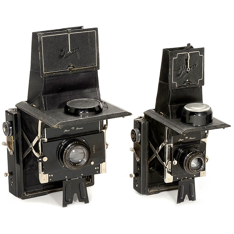 Ihagee, Dresden. 1) Model 2610, c. 1929, horizontal model with rotating back, size 6,5 x 9 cm, no. 357281, with Satz Plasmat 4,5/15 cm, focal plane shutter, focusing screen back. – Excellent condition! (3+/3+) – And: 2) Model 1130, c. 1926, size 10 x 15 c