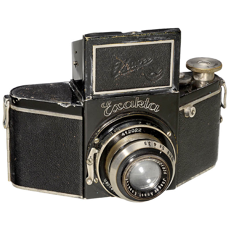 Ihagee, Dresden. No. 412022, black, version 2.2 (back of version 3), Ihagee Anast. Exaktar 3,5/7,5 cm, no. 621836. With extension tubes and case.