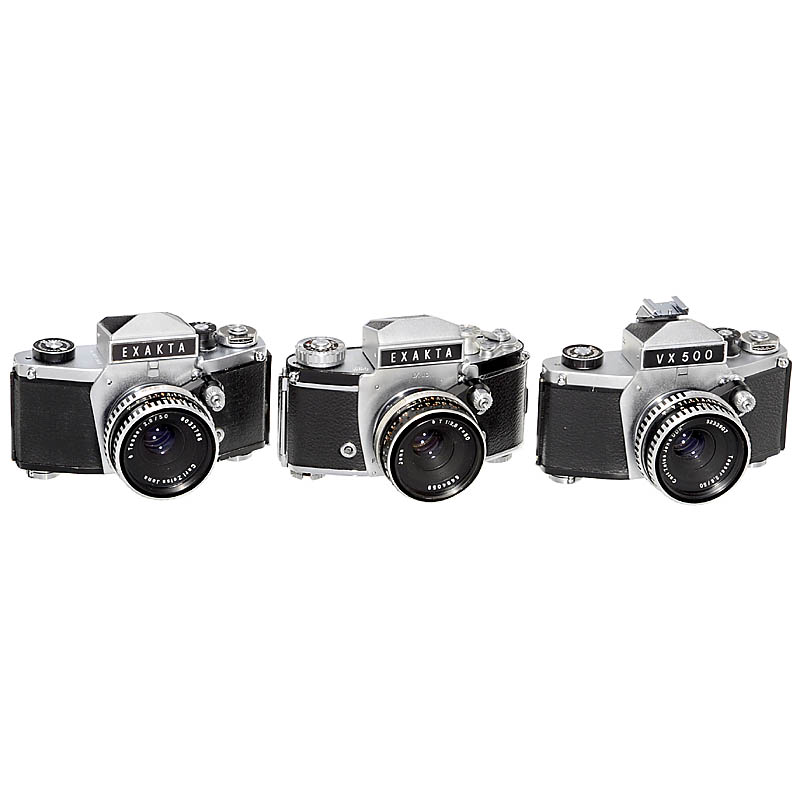 Ihagee, Dresden. 1) Exakta (VX 500), no. 1584895, version without "VX500" label, c. 1969, Tessar 2,8/50 mm, prismfinder. (3–2/2-) – 2) VX 500, no. 1512203, version 4, 1969, Tessar 2,8/50 mm, prismfinder. (3–2/2) – And: 3) VX IIb, no. 1038331, 1963, serial