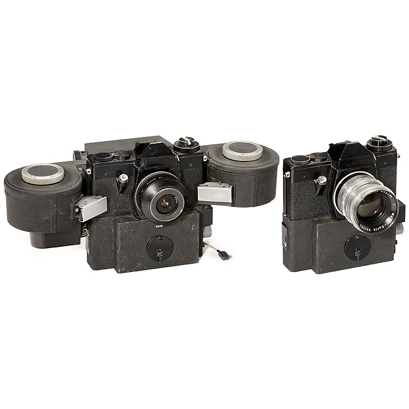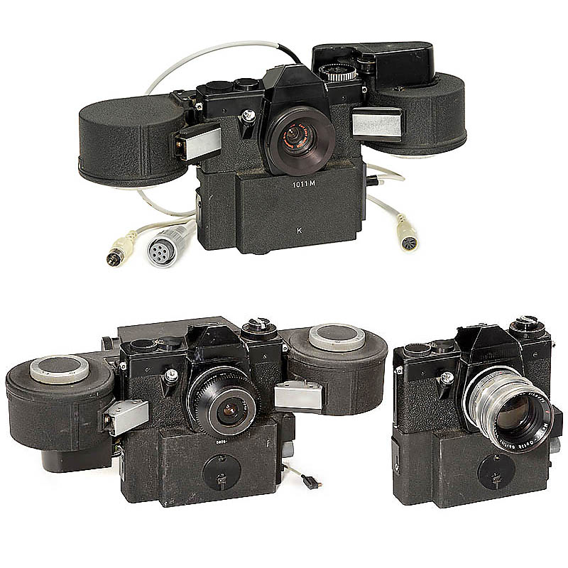 Pentacon, Dresden. 3 SLR cameras with motor (2 cameras with large magazine), lenses: Primoplan 1,9/75 mm (M42), Zeiss Dokumar 8/25 mm (no. 1318) with bayonet mount and one unmarked lens (presumably 2,8/35 mm) with screw mount. – All cameras not tested, pa