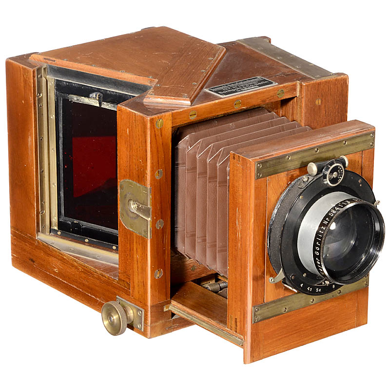 Bermpohl & Co., Berlin. Very low serial no. 646, size 9 x 12 cm, tropical wood with brass fittings, with Plasmat 4/22 cm, light brown bellows, with 2 original filters: green/red. – An impressive and important collector's item and exhibition piece!
