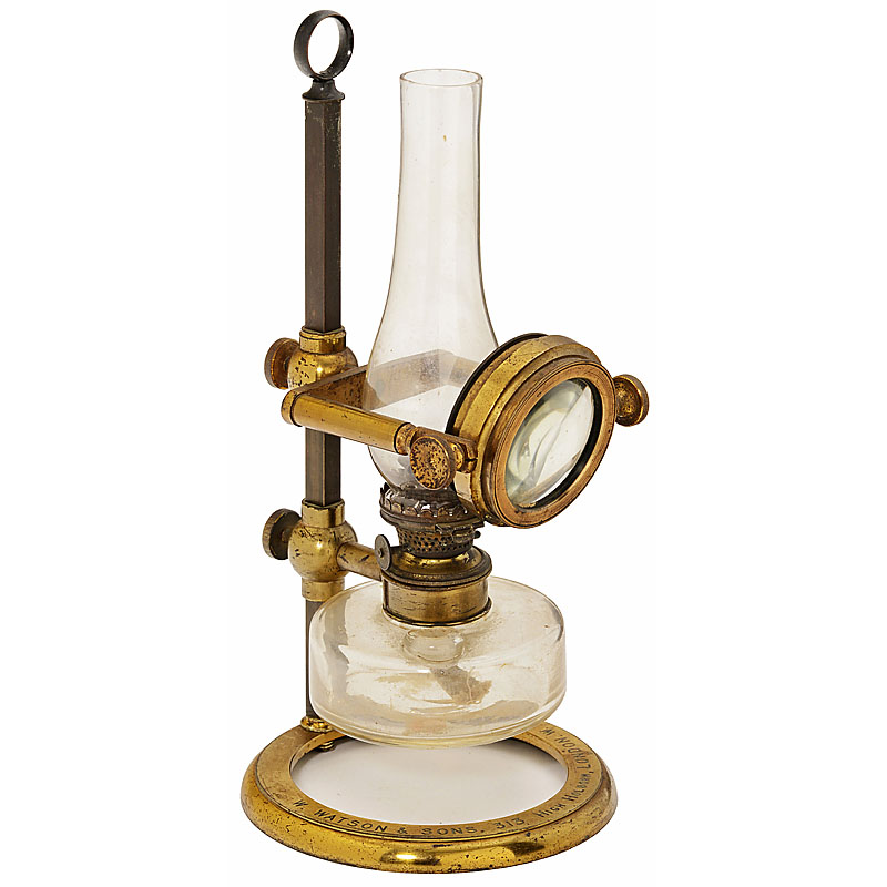 Signed on the cast-brass base ring "W. Watson & Sons, 313 High Holborn, London W.C.". Original lacquered brass, glass oil container and chimney, large rotating condenser lens, height-adjustable burner and condenser, height 11 in., good original condition!