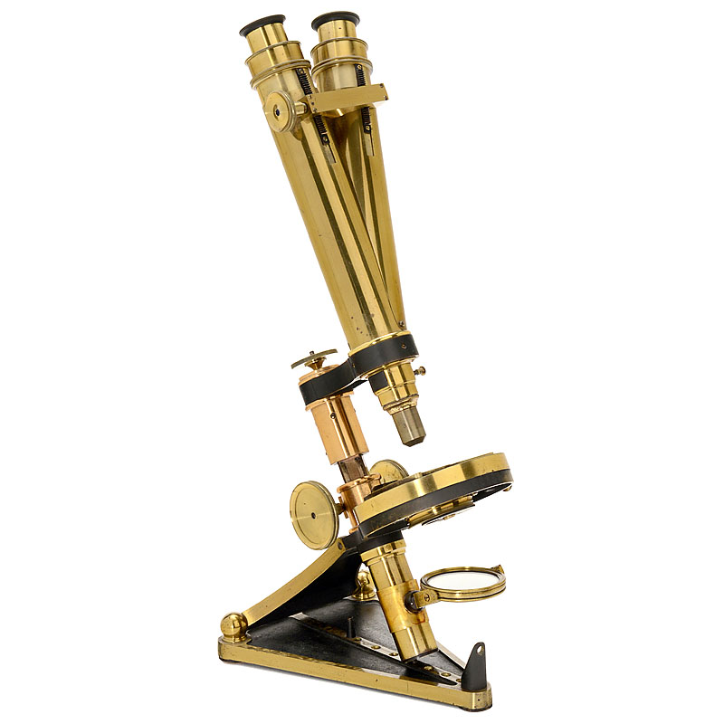 Unusually constructed English microscope, serial no. 5020, original lacquered brass, 2 x coarse and 1 x fine adjustment, turnable table, pinhole diaphragm, concave mirror, height 15 in., with accessories in mahogany case.