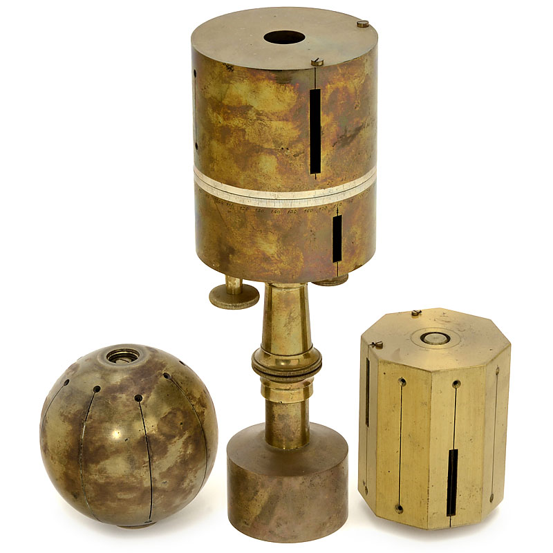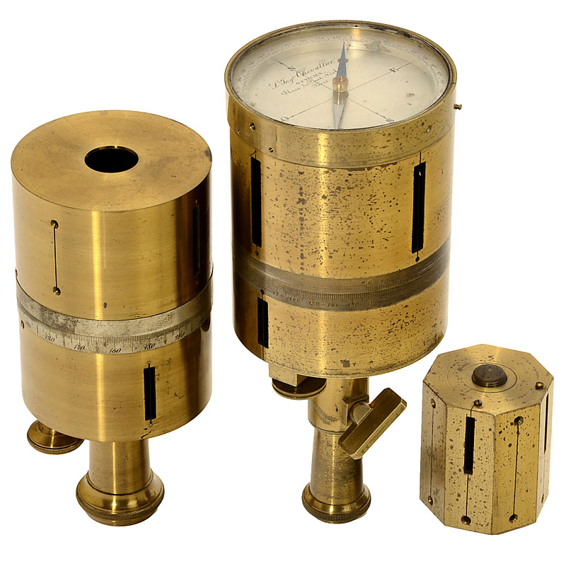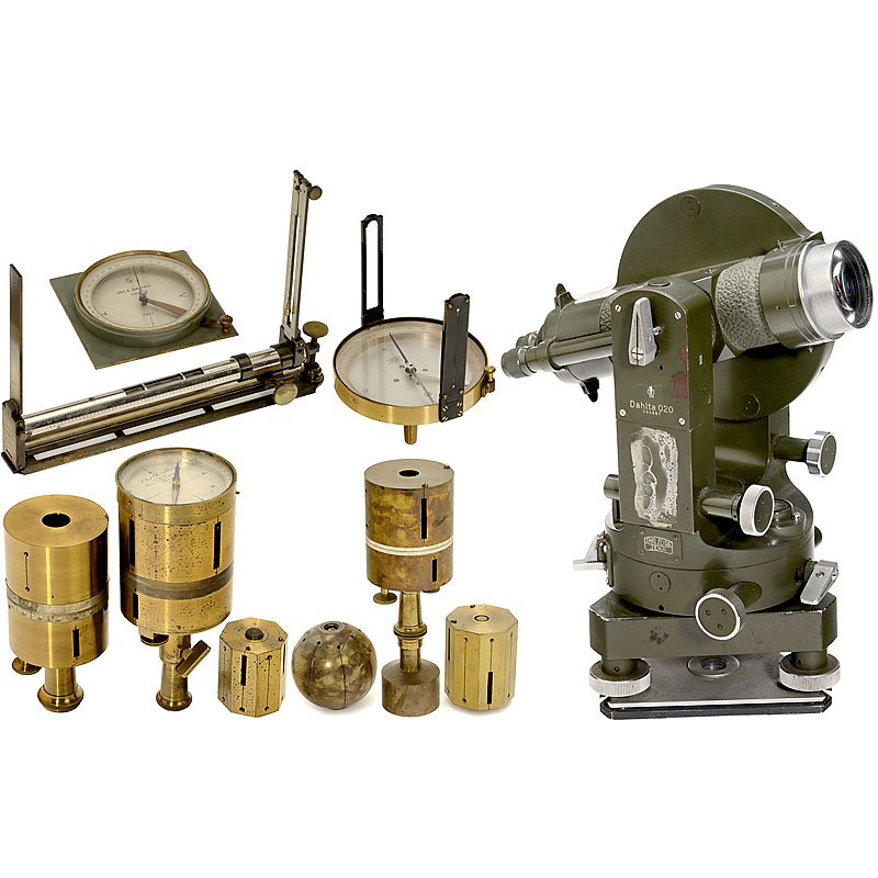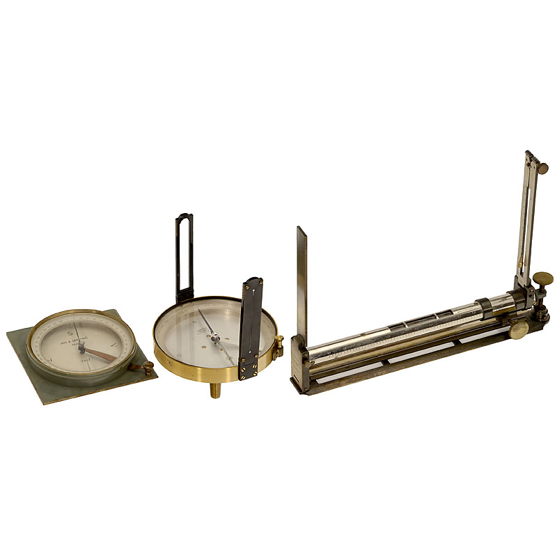 6 surveyor's crosses. 1) Chevallier, Paris, c. 1850, silvered scales, with compass, height 8 in. – 2) Rare cross by Kraft & Söhne, Wien, c. 1860, silvered scale, height 6 ¼ in. – 3) Miniature cross, c. 1840, France, in box, height only 2 ¼ in. – 4) Spheri
