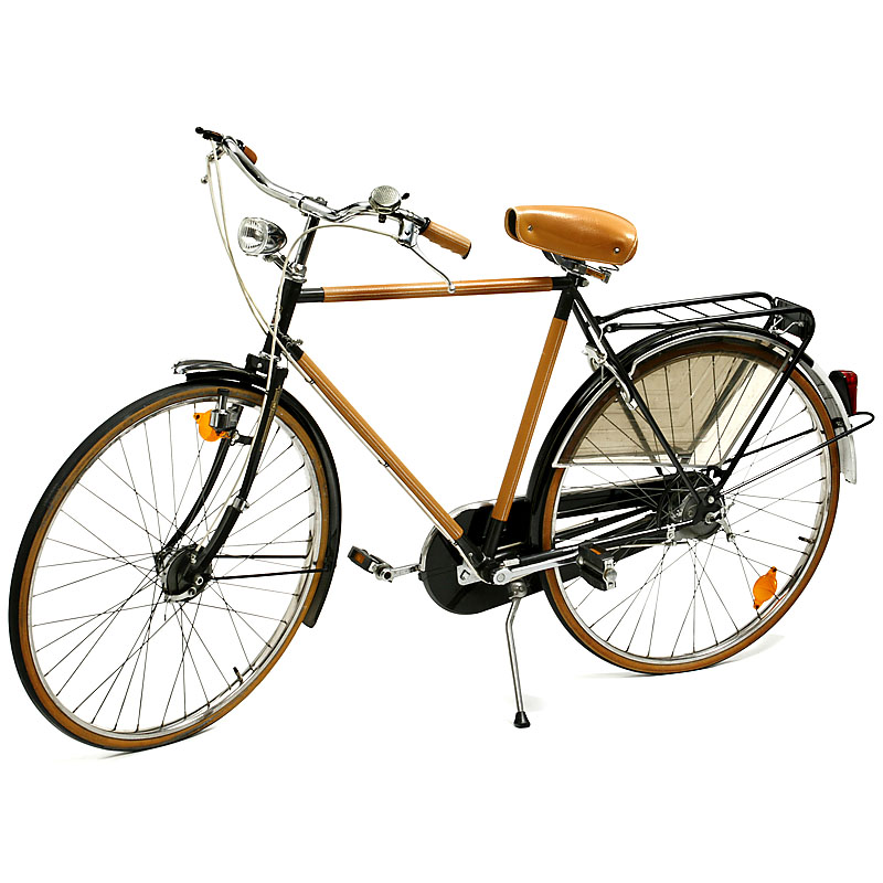 26 in., 3 gears, drum brakes light with dynamo, frame and handle bars wrapped in traditional tan leather, embossed with "Hermes – Paris", nearly new condition, runs smoothly.