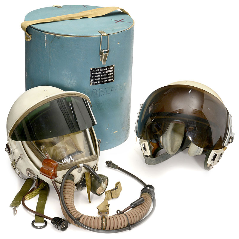 Size no. 2, serial no. 0220466, mask size no. 4, with air tube, microphone and other connections. Production date 02/92. – And: Additional helmet (without accessories).