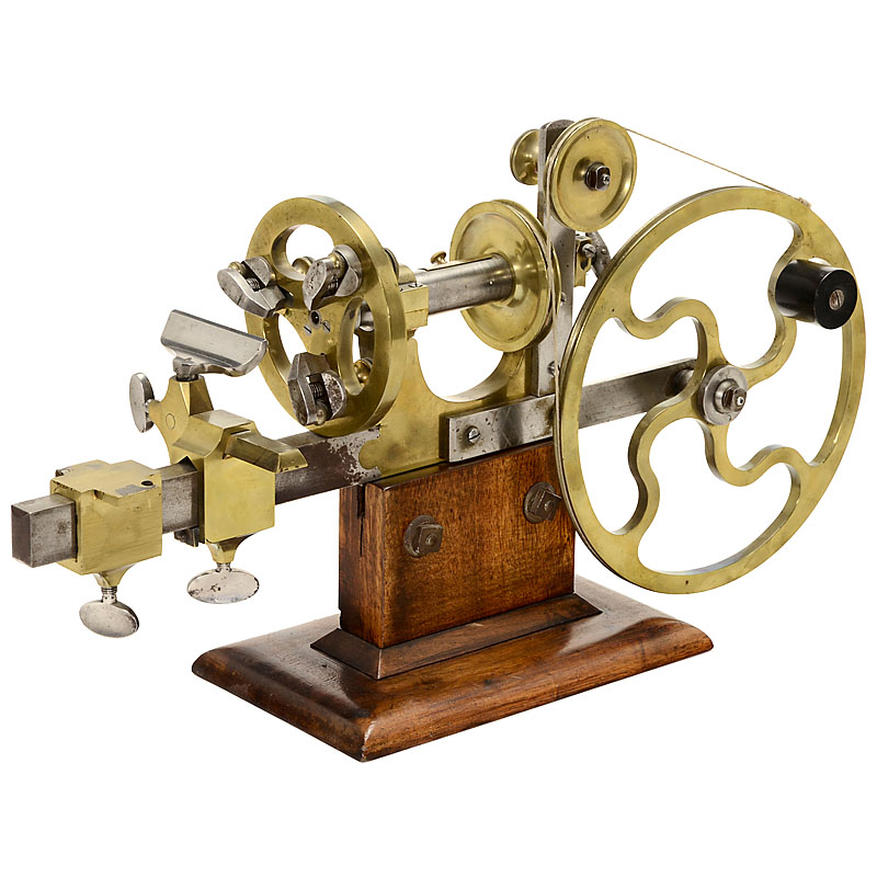 Precision lathe; made of brass, bronze, steel and iron; on wooden base, handcrank-operated, flywheel Ø 7 7/8 in., width 19 ¼ in. Good restored and working condition.