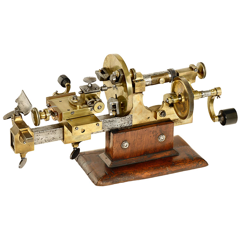 Precision 3-jaw chuck lathe, brass and steel on wooden base, handcrank-operated geared drive, toolpost, toilstock with fine adjustment, width 17 ¾ in., working.