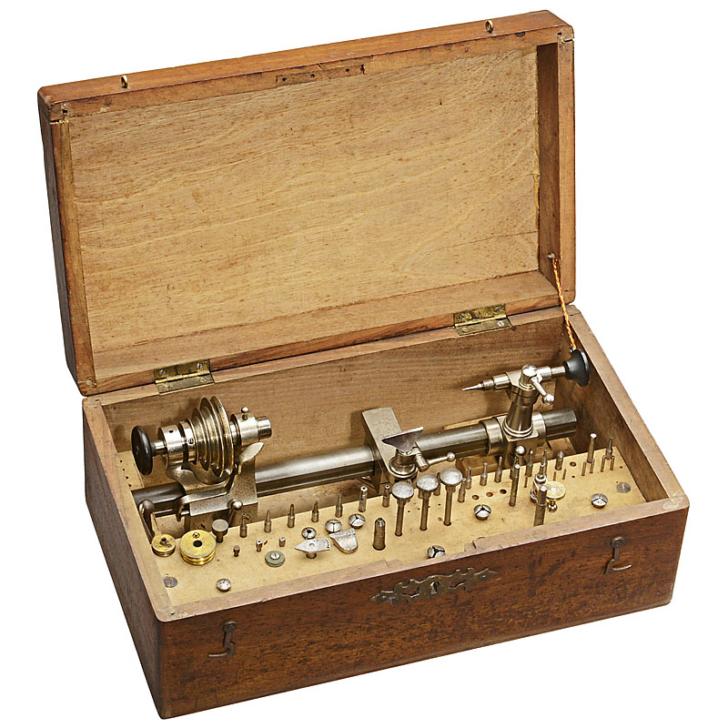 Manufacturer: "Wolf, Jahn & Co., Frankfurt", iron and steel, belt-driven, width 12 in., with costly accessories in wooden case.