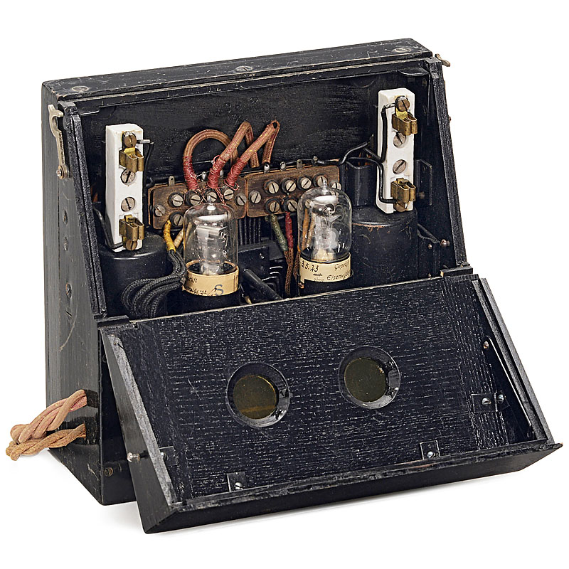 2-valve low-frequency amplifier, wooden case, height 8 2/3 in.