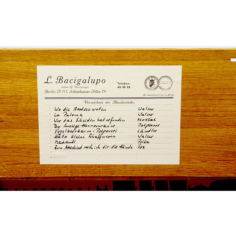 Berlin, Schönhauser Allee 18, 1 stop, 26 notes, front with panflutes, bass pipe under the bottom, barrel by "L. Bacigalupo", very good restored and playing condition. With the typical Berlin sound.