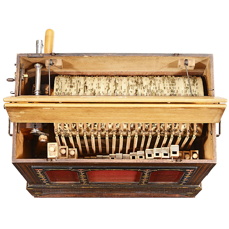 Ignaz Bruder, Waldkirch, Black Forest, 20 notes, 2 ranks of melody pipes and 3 counter basses, in attractive inlaid case, restored pipes and bellows. – Impressive sound with traditional Black Forest intonation.
