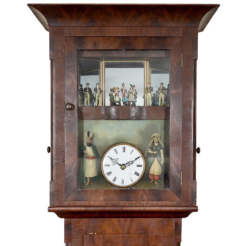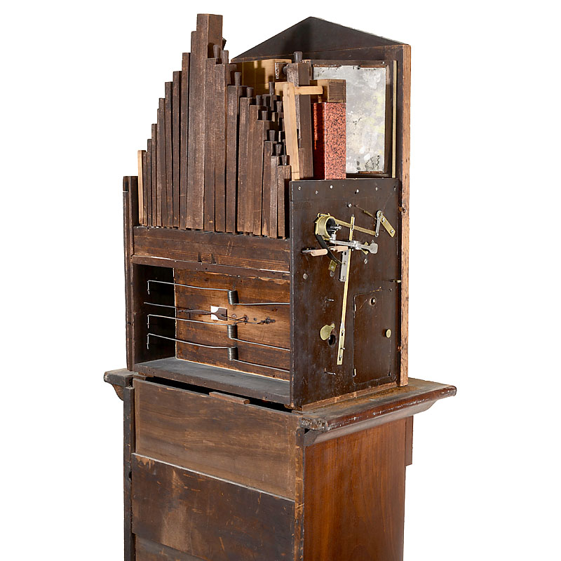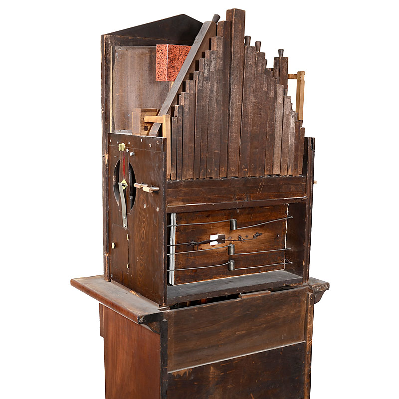 Germany, weight-driven 31-key movement with pinned wooden barrel for 9 tunes, 3 ranks of pipes, 2 stops, brass clockwork mechanism in wood plates, polychrome carved and painted automaton figures of 4 musicians and 8 turning dancers, some with moving arms