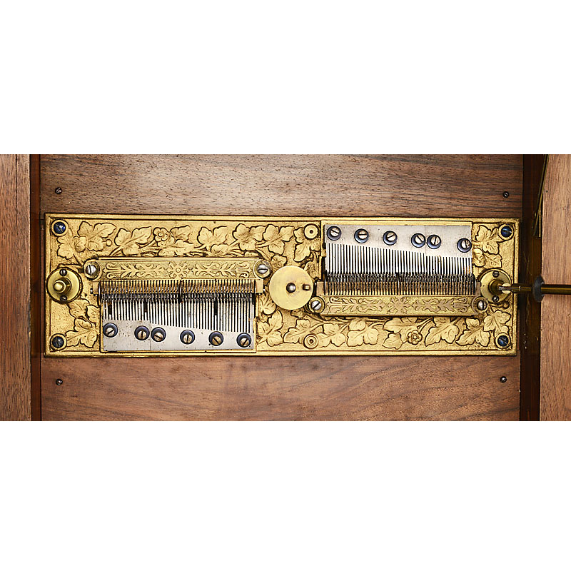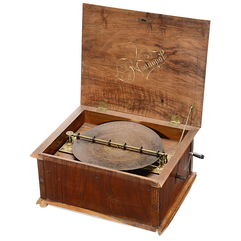 Manufacturer: Leipziger Musikwerke, Paul Ehrlich, for 13 5/8-inch discs, 100 teeth in duplex comb (3 broken), walnut case (3 slats missing), size 20 ½ x 17 x 10 in., with 27 discs. Playing condition. This Monopol box also plays Symphonion discs.