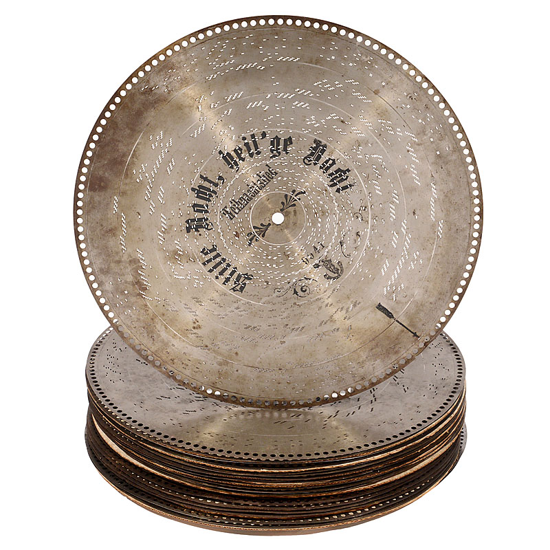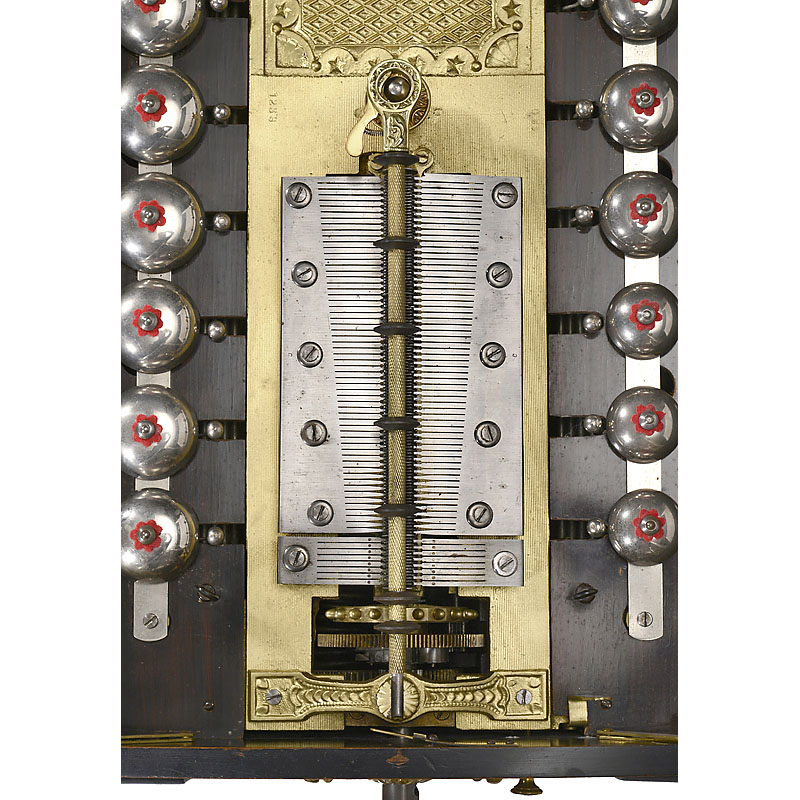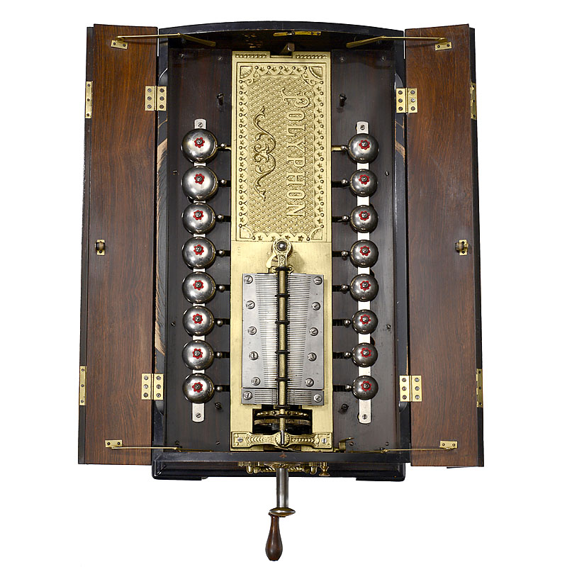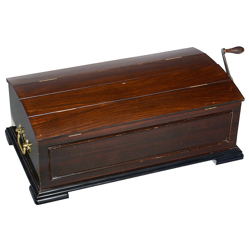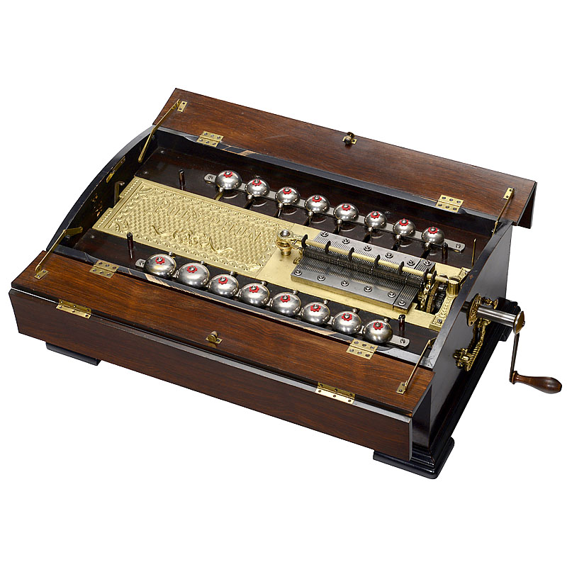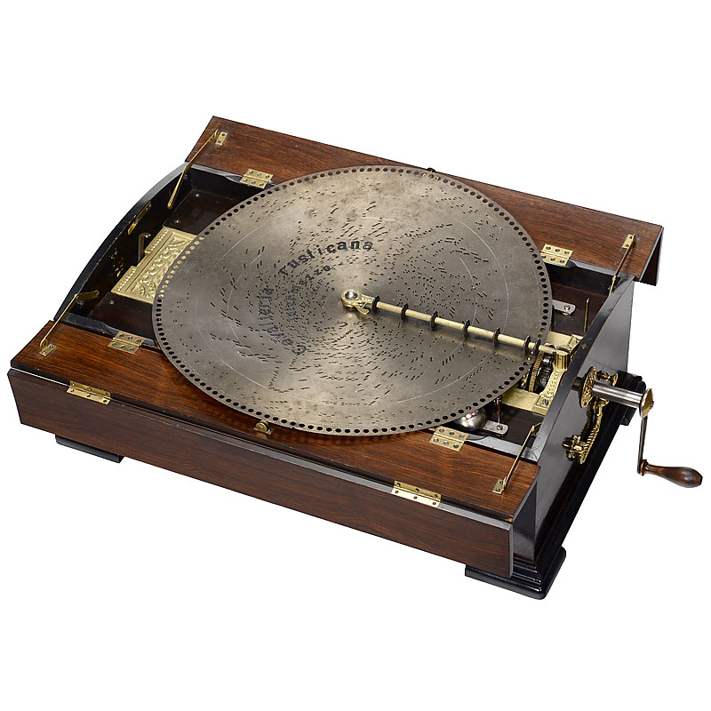 Manufacturer: "Polyphon Musikwerke, Leipzig", with 118 teeth in duplex combs plus 16 bells (complete!!), spiral-spring motor, grained wooden case with four-piece folding casket-lid and 2 carrying handles. With 25 discs. – Only a few of these instruments w