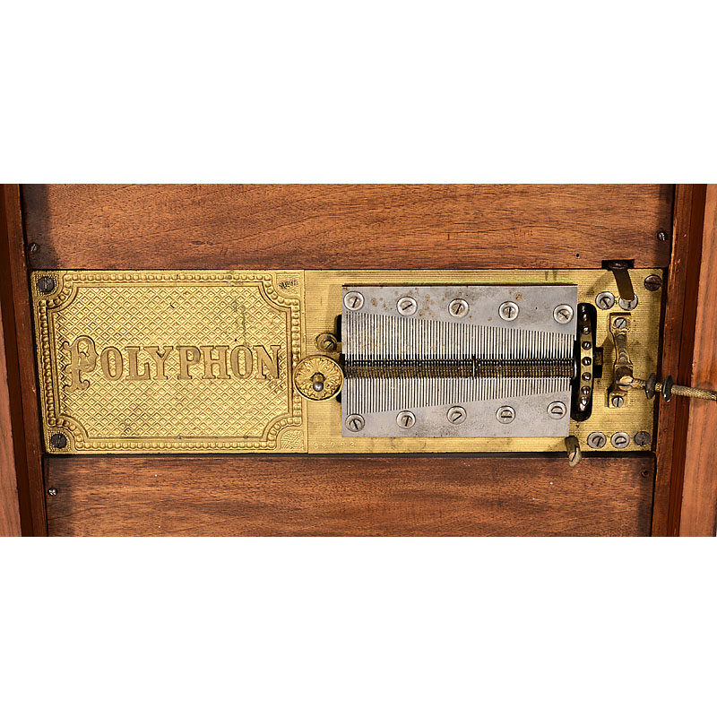 Manufactured by "Polyphon Musikwerke, Leipzig", with 156 teeth in duplex comb (complete), in later carved walnut case, size 23 2/3 x 10 ½ x 31 ½ in., excellent playing condition, with 15 discs.