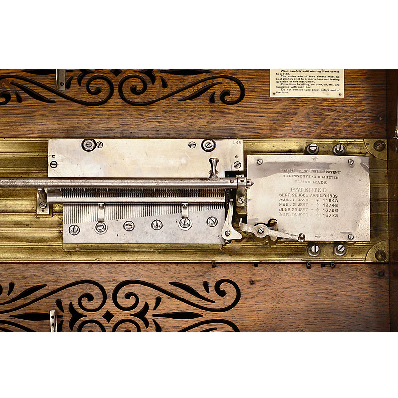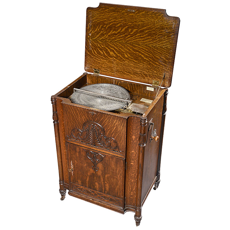 Manufactured by Mermod Frères, Ste-Croix. 168 teeth in duplex comb, complete, speed control, in oak console cabinet with carved columns and ornaments, lateral brass handles, size 29 x 21 ¼ x 41 1/3 in., excellent playing condition, with 15 discs. * * * Wa