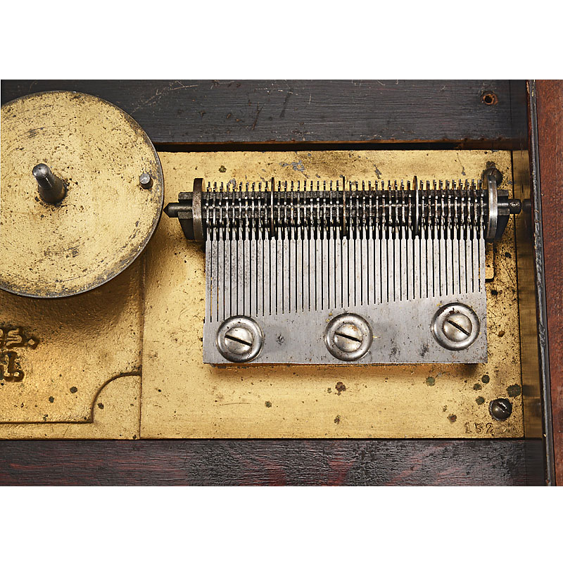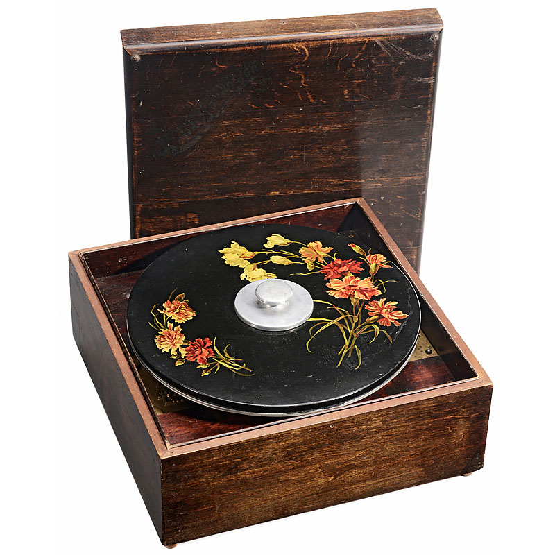 Musikbaukasten, disc musical box notating apparatus by "Liebermann & Co., Berlin", DRP 233705, 40 teeth in single comb (complete), hand-turned movement, with perforated and engraved 11 ¾ in. aluminum disc, divided by beat and notes, without crank and pins