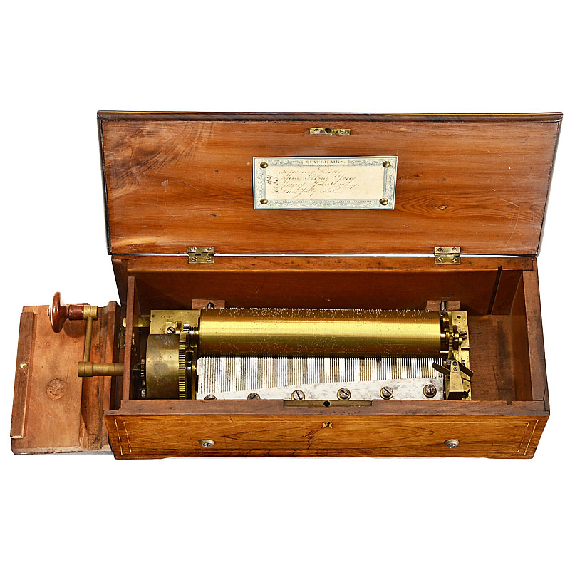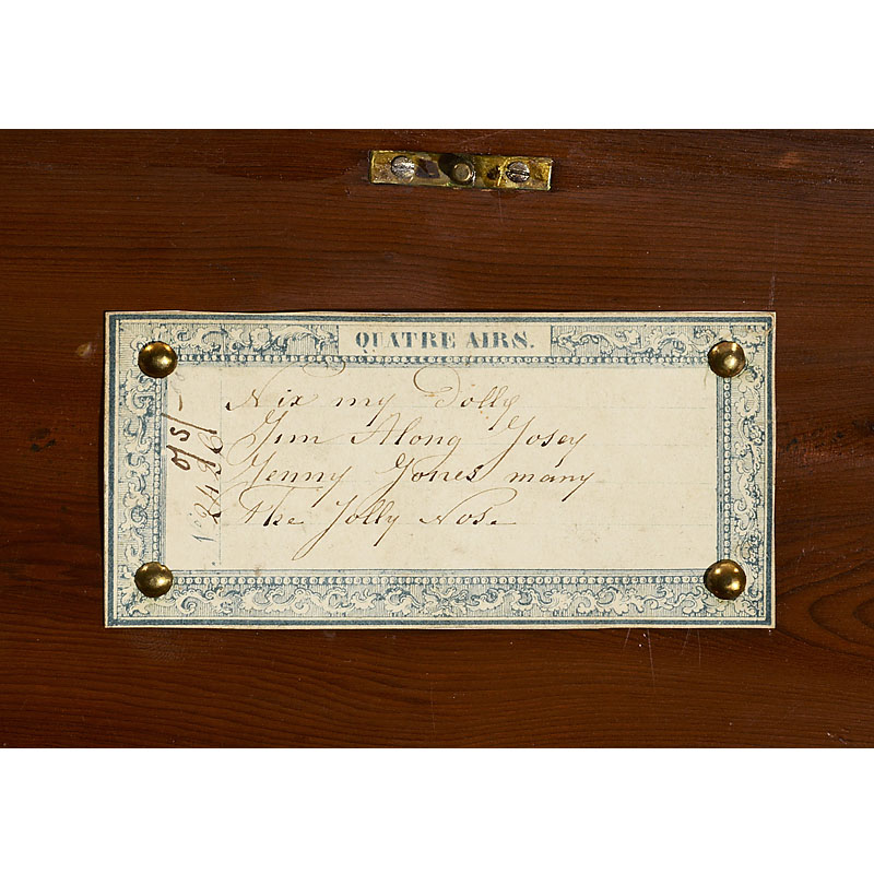 No. 14282, possibly by Lecoultre, playing four lively ballads (Gamme No. 2426), with 115 teeth in comb (complete), brass bedplate and comb-washers, instant-stop control and tune-sheet, in rosewood-veneered case with boxwood stringing and hinged endflap, w