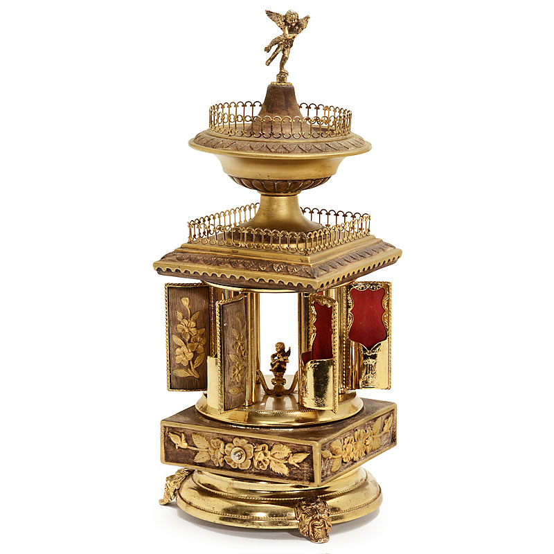 With 6 opening compartments, 2 putti figures and brass base with mask feet, height 16 ½ in. (42 cm).