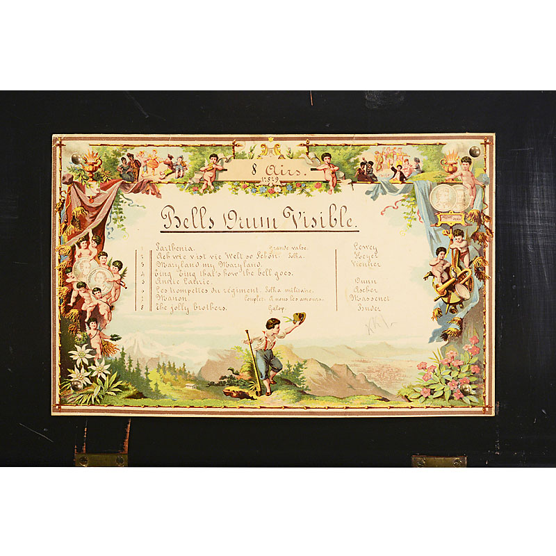 No. 12829, brass cylinder playing 8 airs, with drum and 3 bells, 50 teeth in steel comb (complete), original tune-sheet, grained case, rosewood-veneered lid with musical inlay, 18 in. wide, good playing condition.