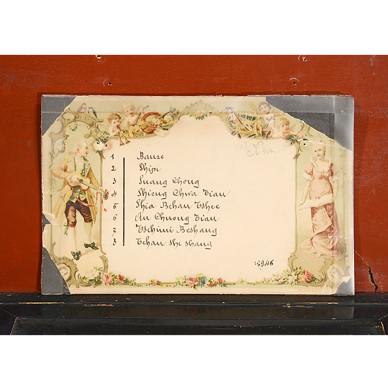 No. 18946, playing eight airs: "Bauze", "Shysi", "Suang Chong", "Shieng Chwwa Tiau", "Shia Bchau Tschee", "Au Chuong Tiau", "Tschinni Beshang" and "Tchau She Shang", with nickel-plated cylinder, 34 teeth in comb (complete), zither, tune-indicator and tune