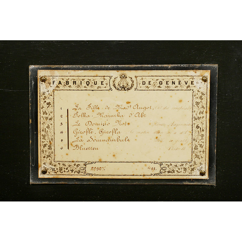 No. 22527, playing six airs including "Le Domino Noir" and "La Somnambule" (Gamme No. 751) accompanied by six optional graduated engine-turned bells with finial strikers, with 97 teeth in musical comb (complete), flat-topped winding lever, tune-sheet and