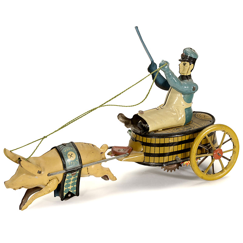 Manufacturer: Walter Stock, Solingen, lithographed tin, clockwork (working), length 7 ½ in., coachman with moving arms, pig with moving ears. With lithograph from the box.