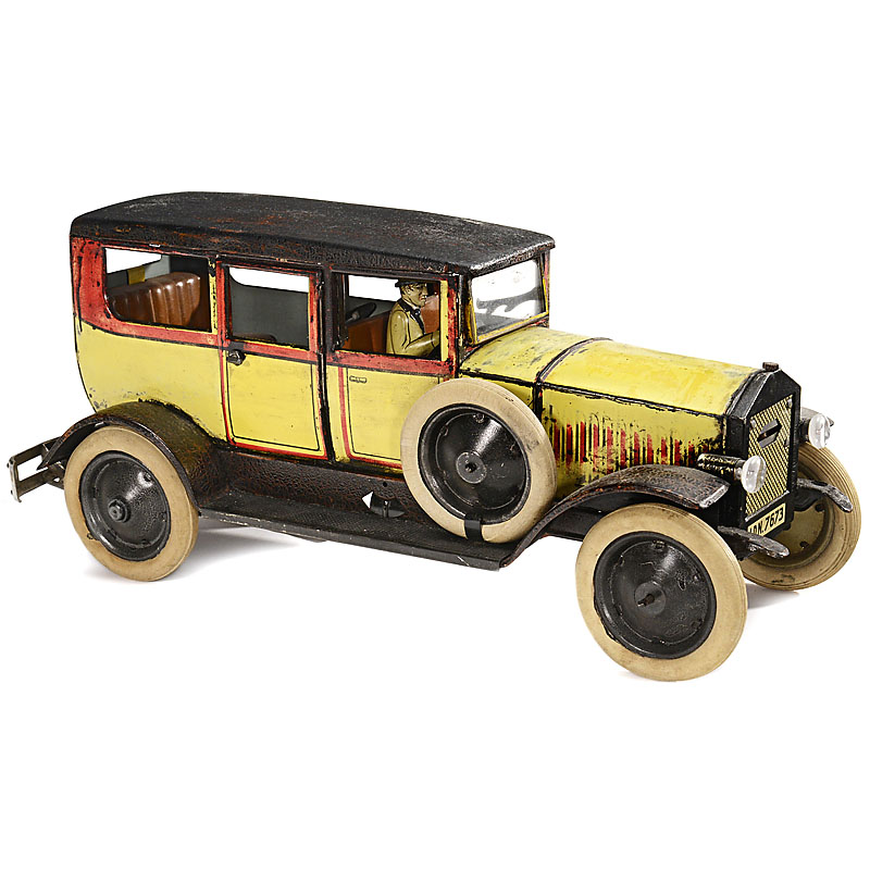 Johann Distler, Nuremberg, lithographed tin, clockwork (defective), electric lighting, rubber tyres, 2 opening doors, adjustable windscreen, driver figure, length 14 ½ in.