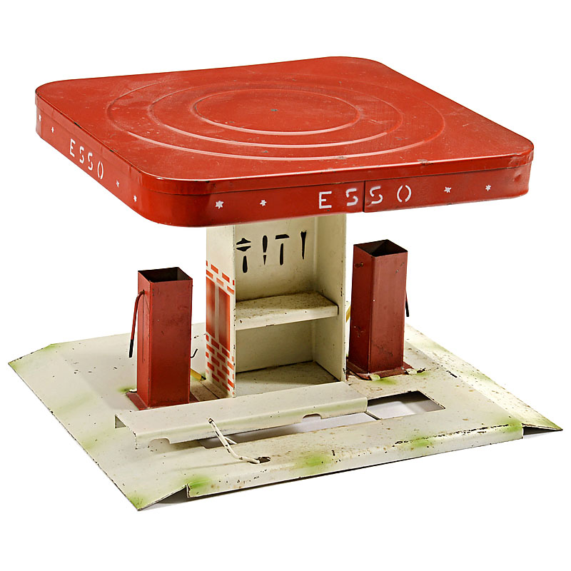 Hand-painted tin, 2 petrol pumps (without roofs), mechanical car-jack, 11 x 9 x 7 ½ in.