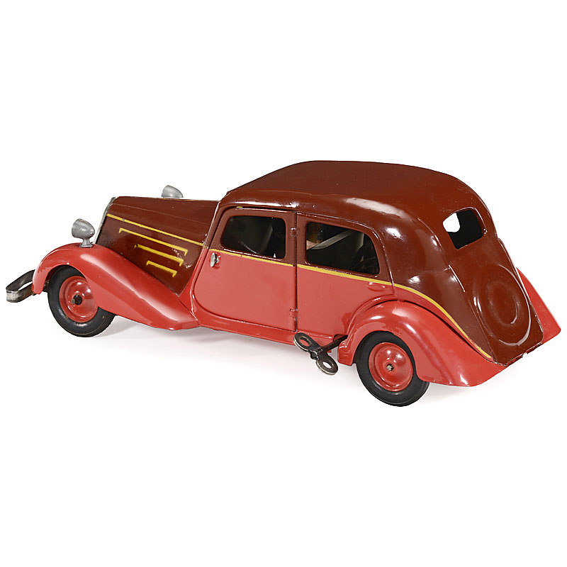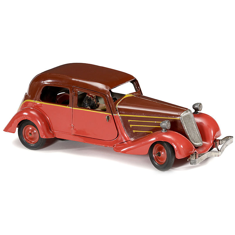 Unis France, painted tin, steerable, seated composition driver (probably added), clockwork, working, length 13 in., very good original condition.
