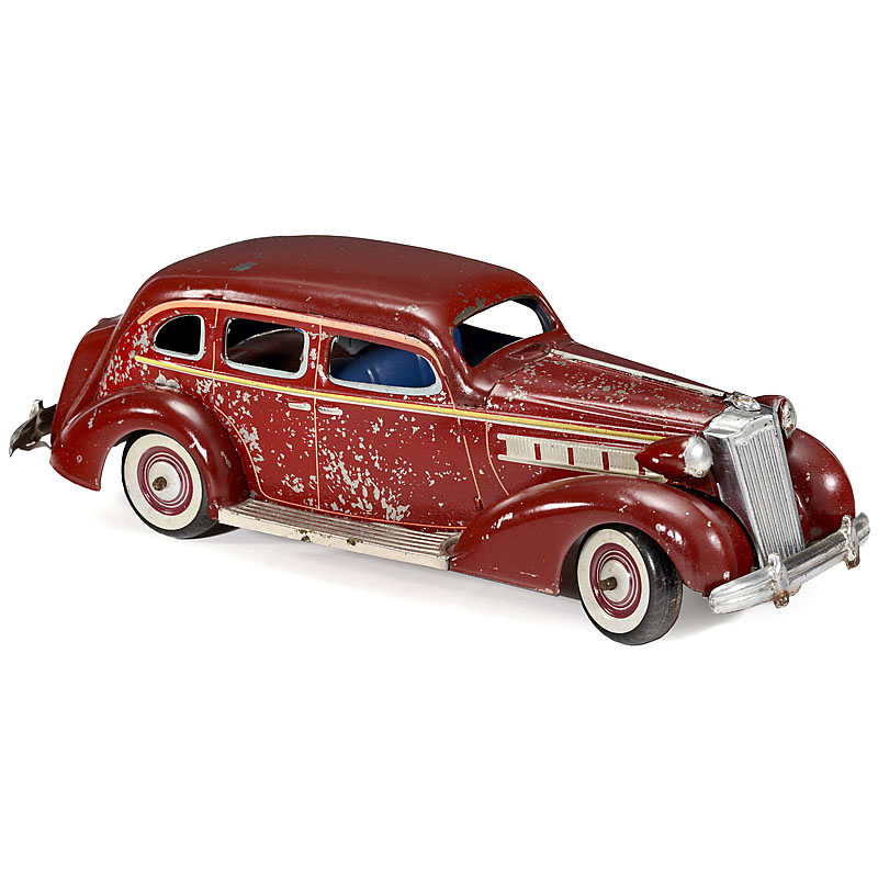 TN, Nomura/Kosuge, Japan. Hand-painted roof and mudguards, lithographed hood and sides, clockwork (working), original condition with some chips, length 11 ½ in.