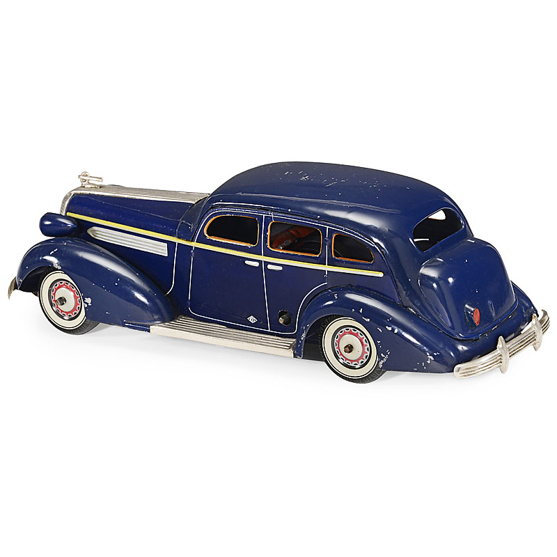 CK, Kuramochi, Japan. Japanned and lithographed tin, with nickeled fittings, clockwork, working, length 12 in. A very rare Japanese tin toy car in good original condition.