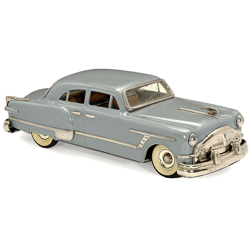 Tin, lithographed interior, extensive nickel trim and bumpers, rubber white sidewall tyres, friction drive, working, length 16 ½ in.