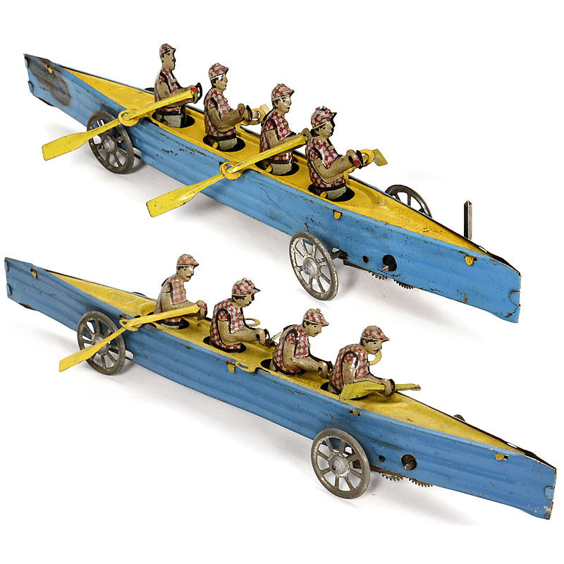 Germany, unmarked, lithographed tin, clockwork (defective), 1 boat missing rudders, length 9 2/3 in. each.