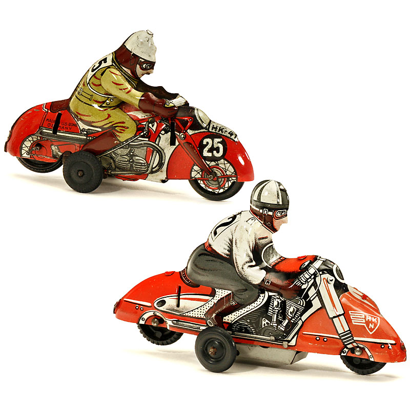 Hubert Kienberger, Nuremberg. Lithographed tin. 1) Friction (working), length 4 ¼ in. – And: 2) Clockwork (working), length 3 ½ in.