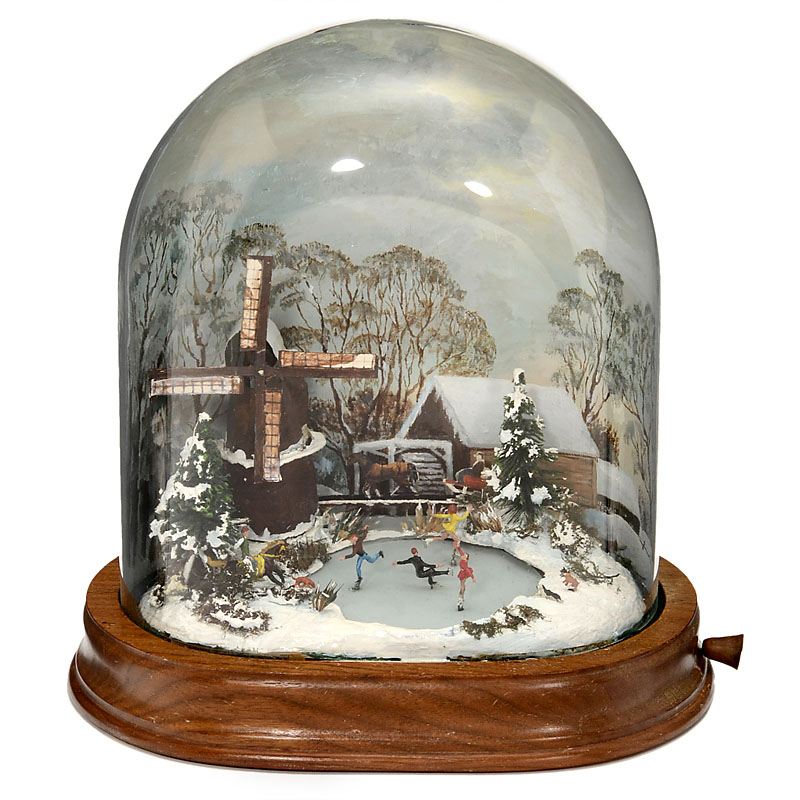 Hand-crafted automaton with single-air pull-string movement controlling 3 skaters performing pirouettes, moving coaches, sledges and turning windmill vanes, under glass dome with hand-painted winter landscape, height 10 ¼ in., windmill split at base, work