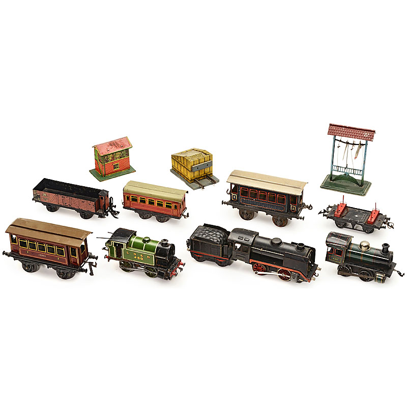 1) Märklin clockwork locomotive R 900 (working). – 2) Hornby clockwork locomotive LNER 460 (working). – 3) Bing clockwork locomotive 485 (defective). – 4) 3 wagons by Zeuke, Bub and Hornby. – 5) 2 passenger cars by Bing, gauge I. – And: 6) 3 accessories.