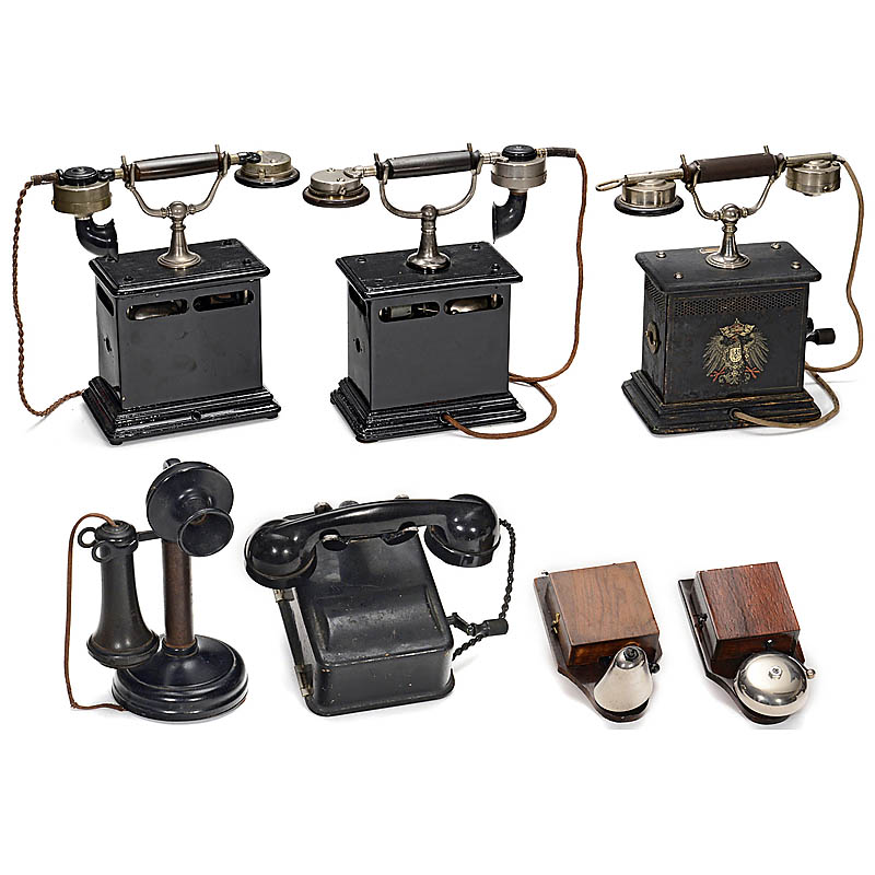 1) "Kellogg", American oak wall phone, adjustable mouthpiece, Bell-type earphone, c. 1905. �?2) 2 direct current bells. �?3) Workshop telephone "Electromagnetica", Bukarest, 1967. �?4) "Kellogg", American candlestick, c. 1910. �?And: 5) 3 German table tel
