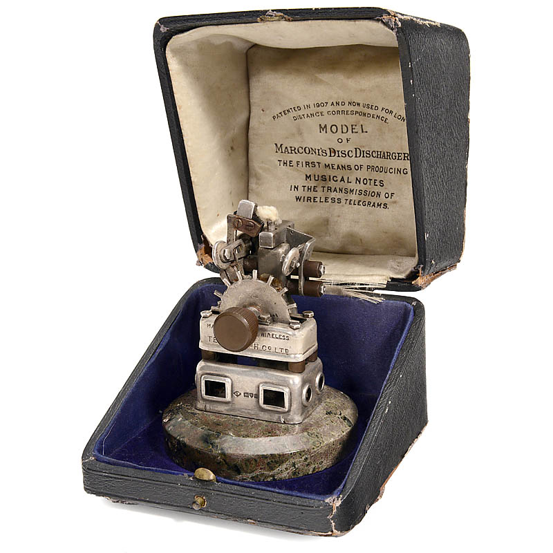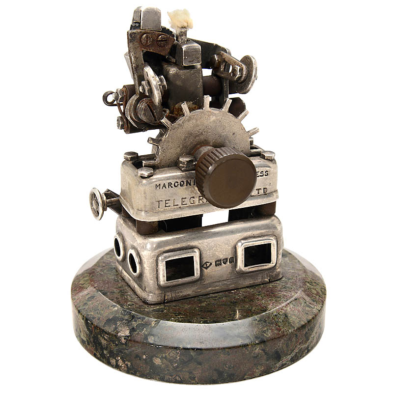 Sterling silver, with multiple hallmarks, engraved on marble base: "Marconi Wireless Telegraph Co. Ltd", height 3 ¾ in., in original leather case. �?A memento to all male participants of the "International Radiotelegraphic Conference in London, 1912". �?T