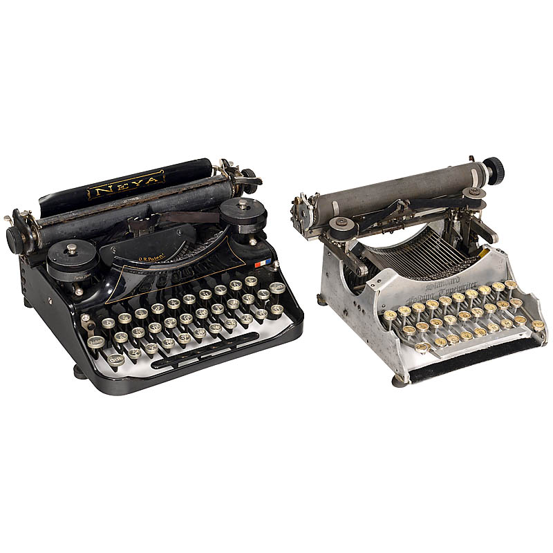 1) "Standard Folding Mod. 1", 1907. – Literature: Martin, 1949, p. 225. – With case. (2-/2) – And: 2) "Neya", 1925. Well-designed German 3-row typewriter made in Berlin, successor to the "Helios". Nice machine! – Literature: Martin, 1949, p. 333. – With c