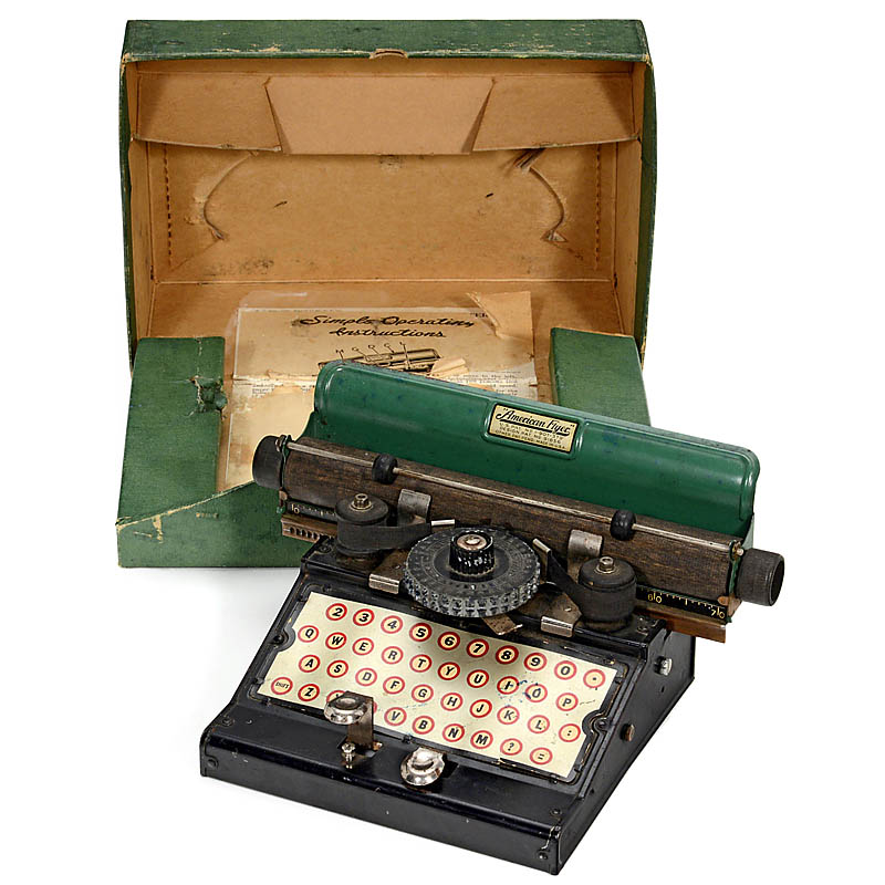Tin toy typewriter with 2-row typewheel and original box with instructions. – Rare outfit!