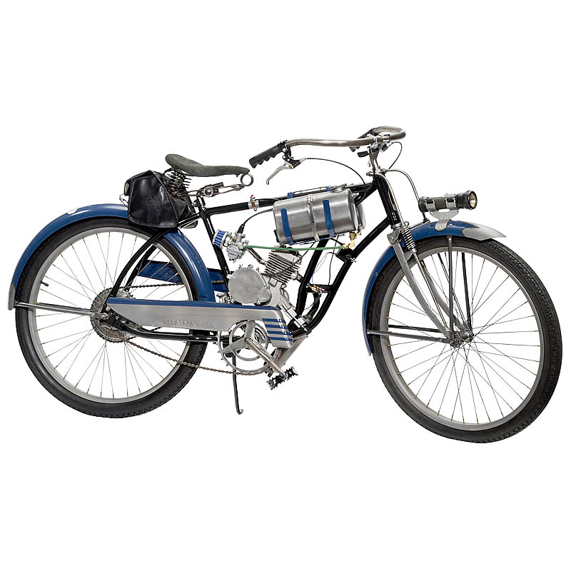 2 cylinders, 66 cc, double tank, detachable front lamp, spring front wheel, leather seat, saddleback, blue/black paint, superb remake. Hard to find in Europe! Excellent condition!