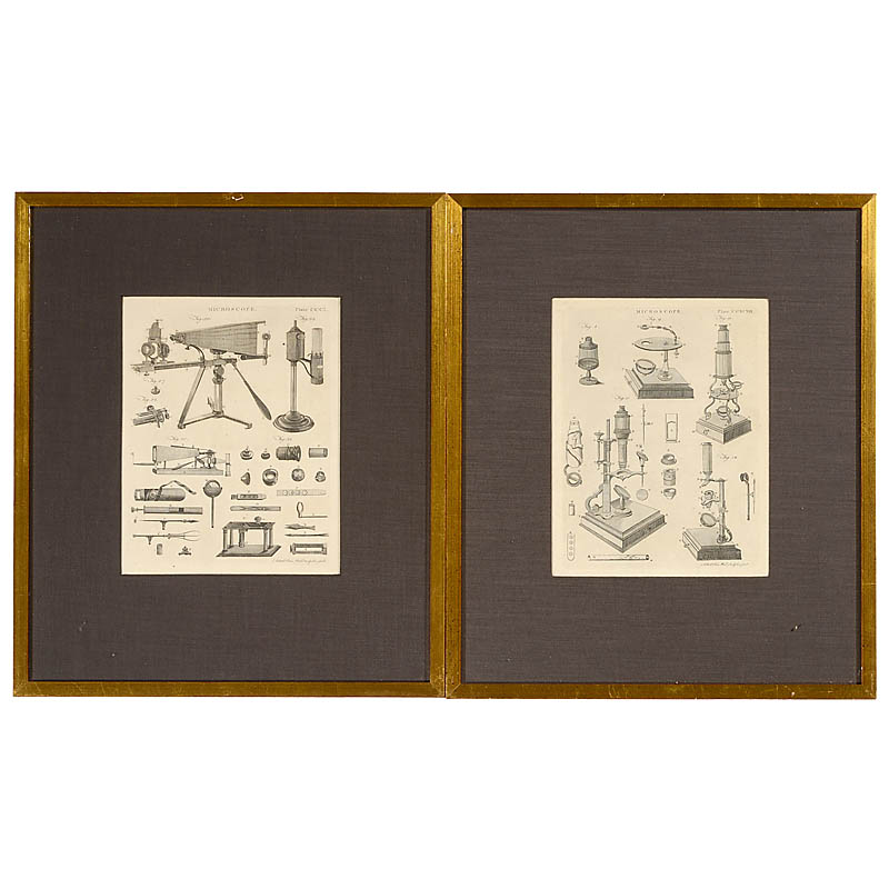 1) 4 microscopy plates with credit "A. Bell Prin. Wal. Sculptor fecit", showing Culpeper, scroll, screw-barrel, pillar and other microscopes. All 7 ½ x 9 ½ in. without frame. – 2) 1 plate with credit "Benard Direx", showing a solar microscope, 9 x 14 ½ in