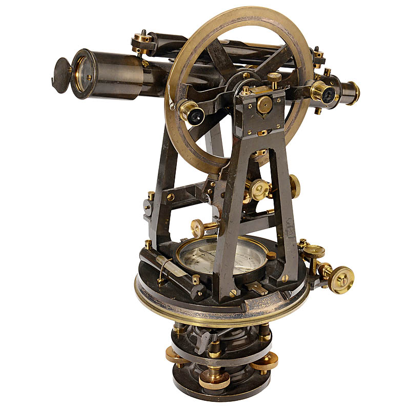 Engraved on the compass: "Stanley, Great Turnstile, Holborn, London", serial no. 8557, original lacquered and oxidized brass, silver scales, 2 magnifiers, 3 levels, length of the telescope 11 ¾ in., height 15 1/3 in., in original mahogany case.