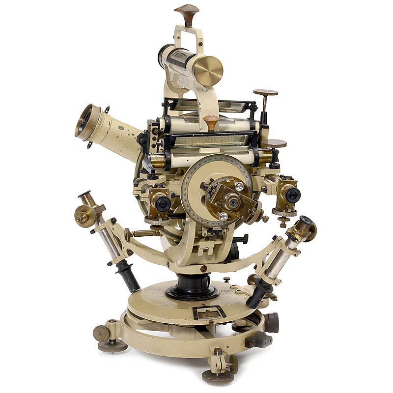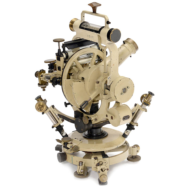 Signed on the horizontal plate "Hildebrand, Freiberg i./S., no. 112102", painted brass, oculars with micrometers, 2 striding levels, 4 telescopic magnifiers, silver scales, length of the telescope 18 1/10, overall height: 19 ¾ in.