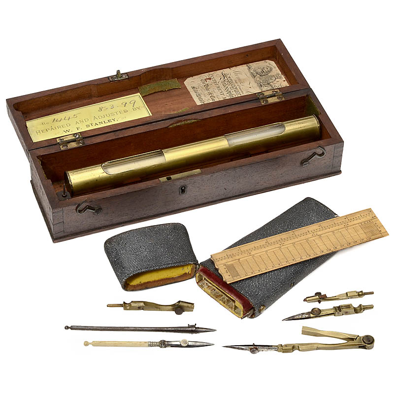 1) English pocket drawing set in tapering black fish-skin etui, comprising typical brass, steel and bone instruments, including a wooden rectangular drawing scale. – And: 2) Spirit level, brass, length 9 in., in mahogany case.