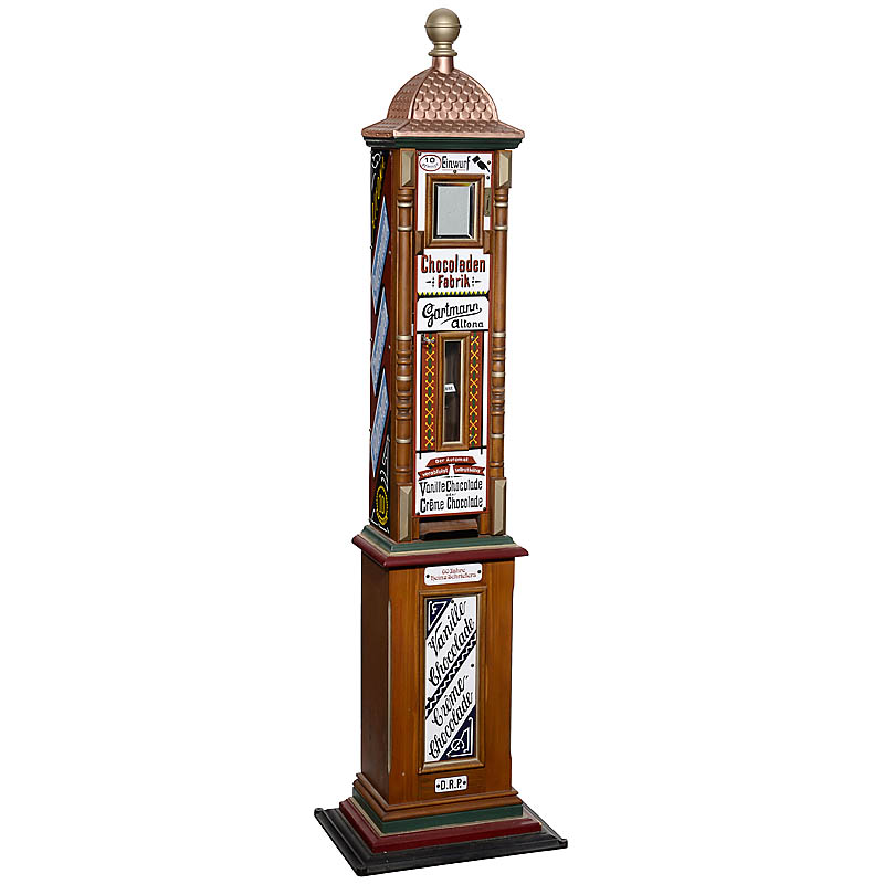 Coin-op wooden case on cast-iron base, 69 in. high, 4 enamel signs, excellent replica. – Very well preserved and in fully working condition! – Very attractive decoration piece!