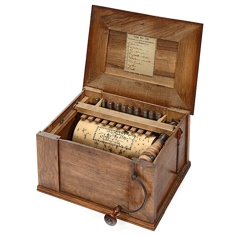 With maker's label on pinned wooden barrel "Husson-Jacotel, Chatenois", 8 tunes, length of the barrel 6 2/3 in., 10 metal pipes, walnut case with original tune sheet, playing mostly operetta melodies. Good playing condition.