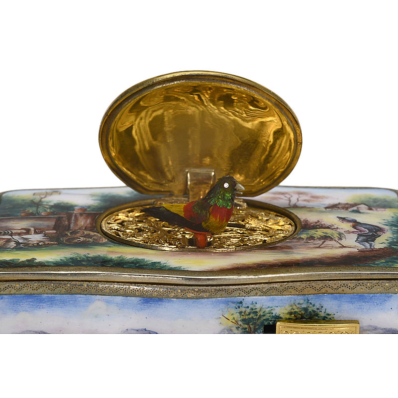 Stamped "EB", with 5 hand-painted enameled panels and lid depicting landscape and pastoral scenes, going-barrel motor causing bird to sing and turn, flap his wings and open and close his beak, with bird-form key. Very good working condition.